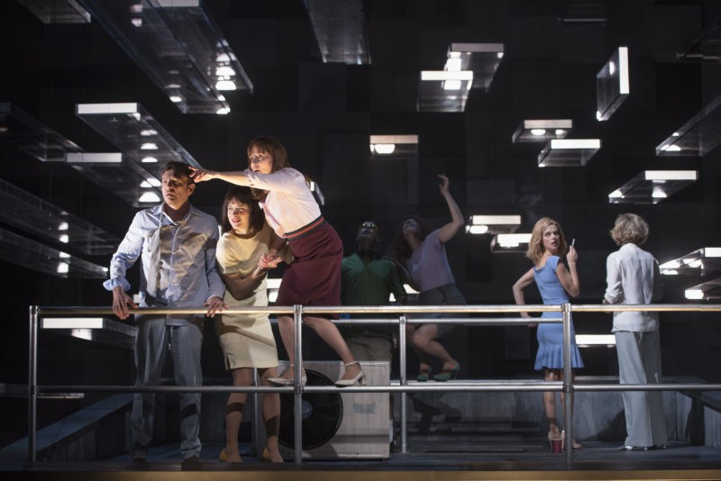 Le contraste que vous énoncez entre transparence et dissimulation est très juste. Et nous avons effectivement pensé à l’image du plongeoir. C’était tout à fait volontaire. Il y a toutefois une dimension supplémentaire : comment rendre compte de la hauteur d’un gratte-ciel et du vertige ? Pas facile au théâtre ! Andrew [D Edwards, le scénographe, NDLR] a eu l’idée d’inverser la vision, non pas en regardant du bas, mais bien du haut : tel est le sens de ces barres sur le mur du fond de la scène. Elles sont comme une vue surplombant les gratte-ciels de New York ou de la Défense.