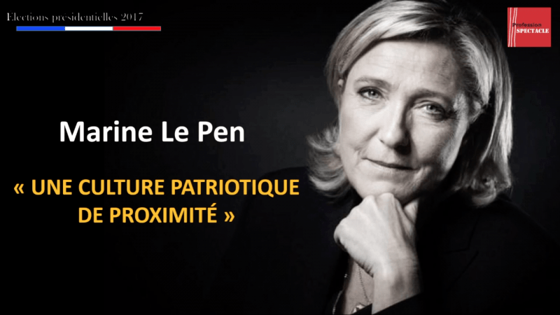 Certains sujets se font en revanche très discrets ; parmi ces derniers, la question culturelle. Sur les 144 engagements de Marine Le Pen, seules quelques propositions disparates concernent la culture, sujet qu’elle n’a abordé publiquement qu’une seule fois ces derniers mois, lors de son discours du 9 novembre 2016 durant lequel elle aborde sa vision d’UNE CULTURE PATRIOTIQUE DE PROXIMITÉ.