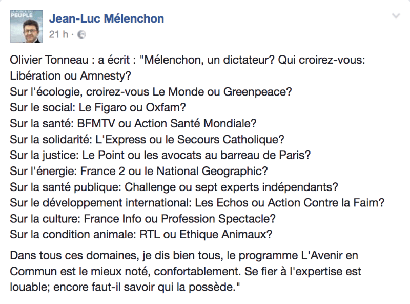 Un article publié par Georges Ledoux-Lanvin sur Mediapart, repris par Olivier Tonneau, repris par… Jean-Luc Mélenchon lui-même affirme que Profession Spectacle – entre autres – considère le programme du candidat de la France Insoumise comme « le mieux noté ». Un visuel circule également sur les réseaux sociaux, faisant de notre média un soutien du candidat du Front de Gauche. Il n’en est rien. À aucun moment, nous ne prenons position pour l’un ou l’autre.