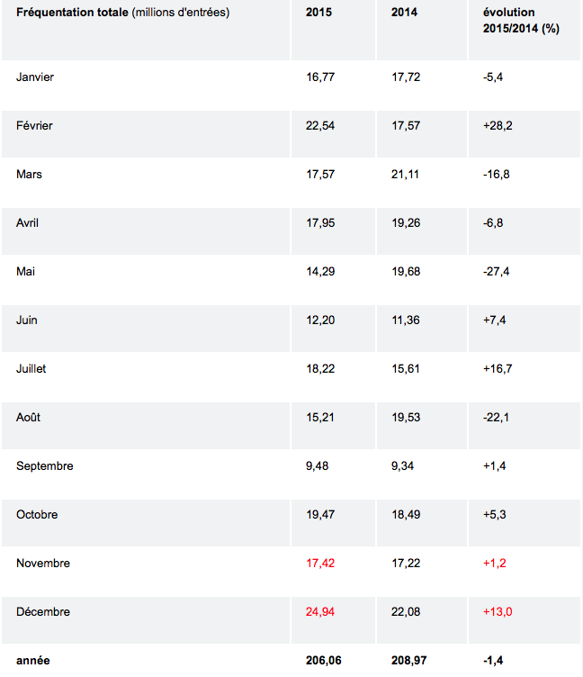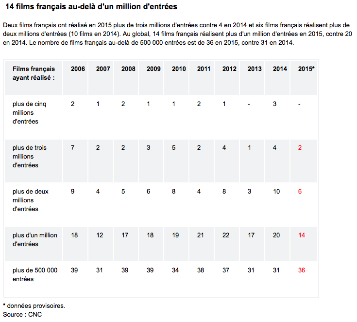En 2015, la fréquentation des salles de cinéma demeure à un niveau particulièrement élevé avec 206 millions d’entrées (- 1,4 %). Ce résultat est au-dessus du niveau moyen des dix dernières années (199,58 millions). La fréquentation des salles de cinéma en France est toujours en 2015 la plus élevée d’Europe.