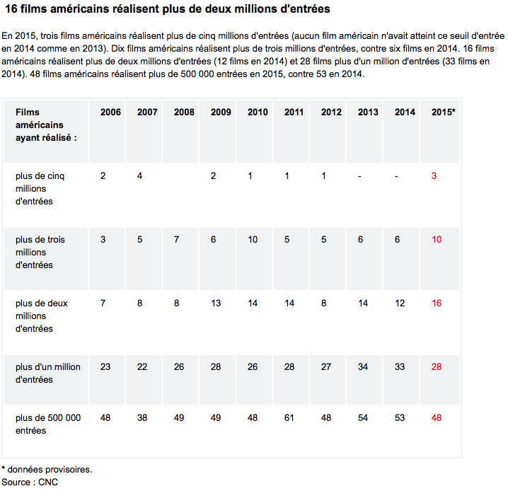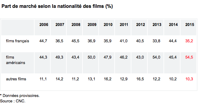 Après une année 2014 exceptionnelle pour les films français, leur part de marché atteint 35,2 % en 2015, celle des films américains est de 54,5 % et celle des films d’autres nationalités de 10,3 %.