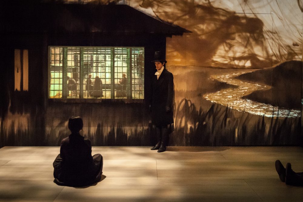 Sur la scène totalement nue du Studio de la Comédie-Française, trois pans de bois encadrent l’action qui n’a pas lieu. Y sont peints des arbres imposants, aux sombres branches comme des voûtes de cathédrale, abritant religieusement la maison et sa vaste fenêtre – un écran blanc sur lequel est projetée la création graphique de Stephan Zimmerli. La scénographie conçue par Marc Lainé, soutenue par l’animation vidéo des dessins de Richard le Bihan, s’inspire explicitement du théâtre nô ; elle rappelle également la peinture flamande du début du XXe siècle, de Fernand Khnopff à Paul Delvaux, plus encore de l’artiste d’Ostende, Léon Spilliaert.