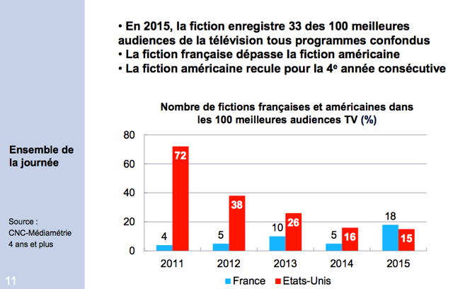 Une concurrence décevante qui pourrait être renforcée par l’incitation au financement de la fiction par les chaînes TNT, encore problématique1, mais surtout par le développement des apports étrangers (en baisse de 57 % en 2015) et l’exportation. Un développement qui devrait bientôt avoir lieu, selon Vincent Leclercq : « Jusqu’à présent, la fiction française était orientée vers le format de 90 minutes, difficilement exportable. Le relèvement du crédit d’impôt pourrait inciter à redynamiser les séries, tandis que la perspective d’un festival international des séries pourrait faire mieux connaître la production hexagonale. »