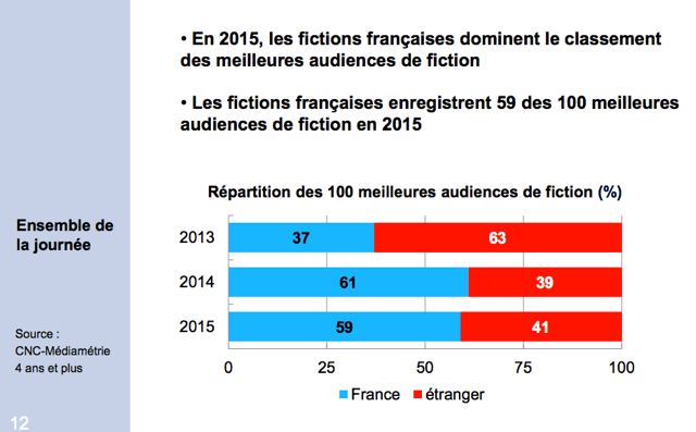 Indéniablement, la fiction française connaît de bonnes audiences face aux fictions étrangères, américaines en particulier. En 2015, sur les 100 meilleures audiences enregistrées, la fiction française représente plus d’une fiction sur deux. Une tendance qui semblerait se renforcer au début 2016 : sur les quatre premiers mois en effet, la fiction française réalise 71 des 100 meilleures audiences. Des indicateurs qui font dire à Frédérique Bredin, présidente du CNC : « En 2015, le succès de la fiction française à la télévision se confirme et se renforce. Tous les indicateurs sont au vert, la fiction française est en tête du palmarès des meilleures audiences. »