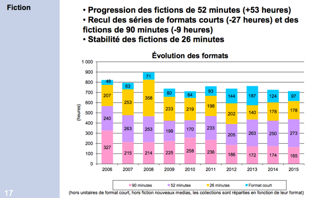 Au-delà du débat sur la diversité et la valeur des créations, l’enjeu dans un futur proche sera pour les productions de répondre à cette demande de manière pertinente. Le volume des fictions aidées par le CNC, qui représente l’essentiel des productions, continue de diminuer, pour représenter moins de la moitié des volumes de fictions allemands ou britanniques, comme l’indique Vincent Leclercq, directeur de l’audiovisuel et du numérique au CNC.