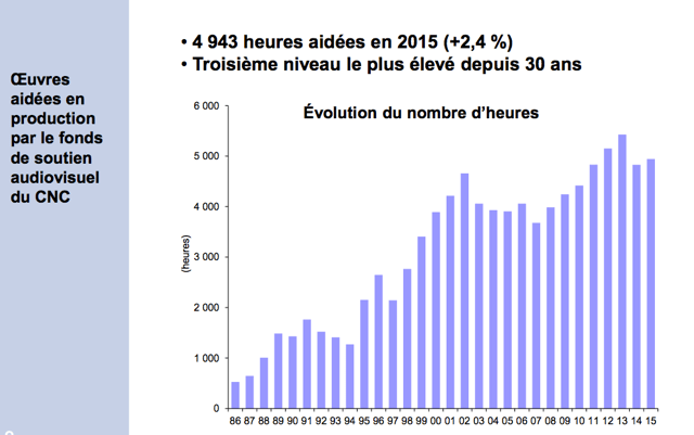L’animation fait encore office, quant à elle, de fierté française. Le milieu continue son expansion ; le CNC l’accompagne en 2015 avec une hausse des volumes aidés de près de 10 % (285 heures). On observe une relative baisse en apport des diffuseurs, mais les effets du crédit d’impôt à l’animation sont apparemment forts et efficaces, avec notamment le rapatriement de certaines productions en France : Xilam à Lyon, Superprod et Samka à Angoulême. Ces exemples, qui permettront la relocalisation des tournages en France, sont, pour Frédérique Bredin, la conséquence directe du crédit d’impôt.