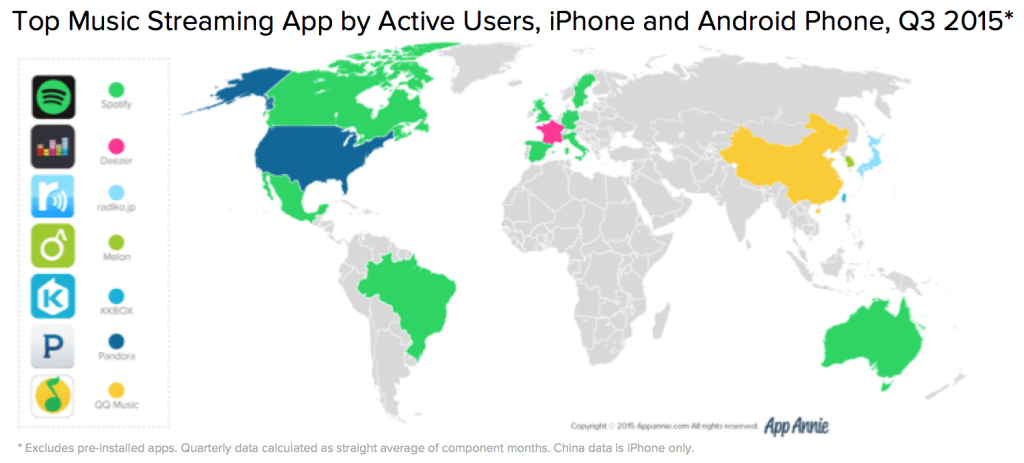 En termes d’utilisateurs actifs, Spotify domine la plupart des grands marchés nationaux : Allemagne, Australie, Brésil, Canada, Espagne, Italie, Mexique, Royaume-Uni, etc. En Occident, seuls les États-Unis avec Pandora (2e au classement général) et la France avec son petit protégé Deezer (5 ou 6e au classement général), résistent encore et toujours à l’envahisseur nordique.