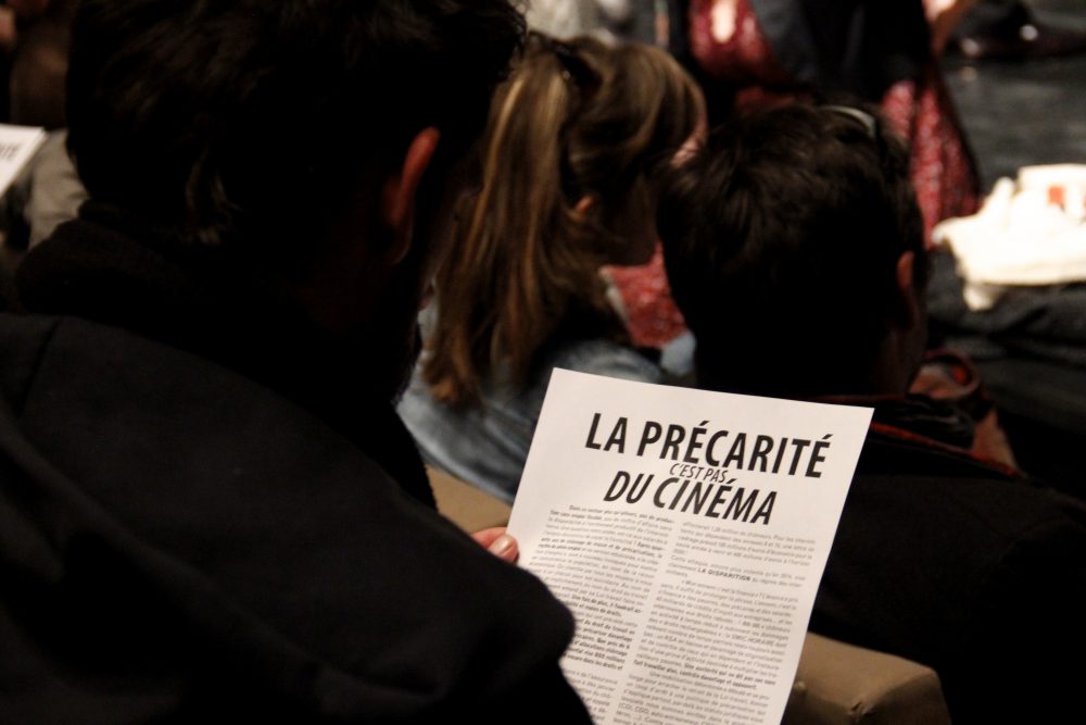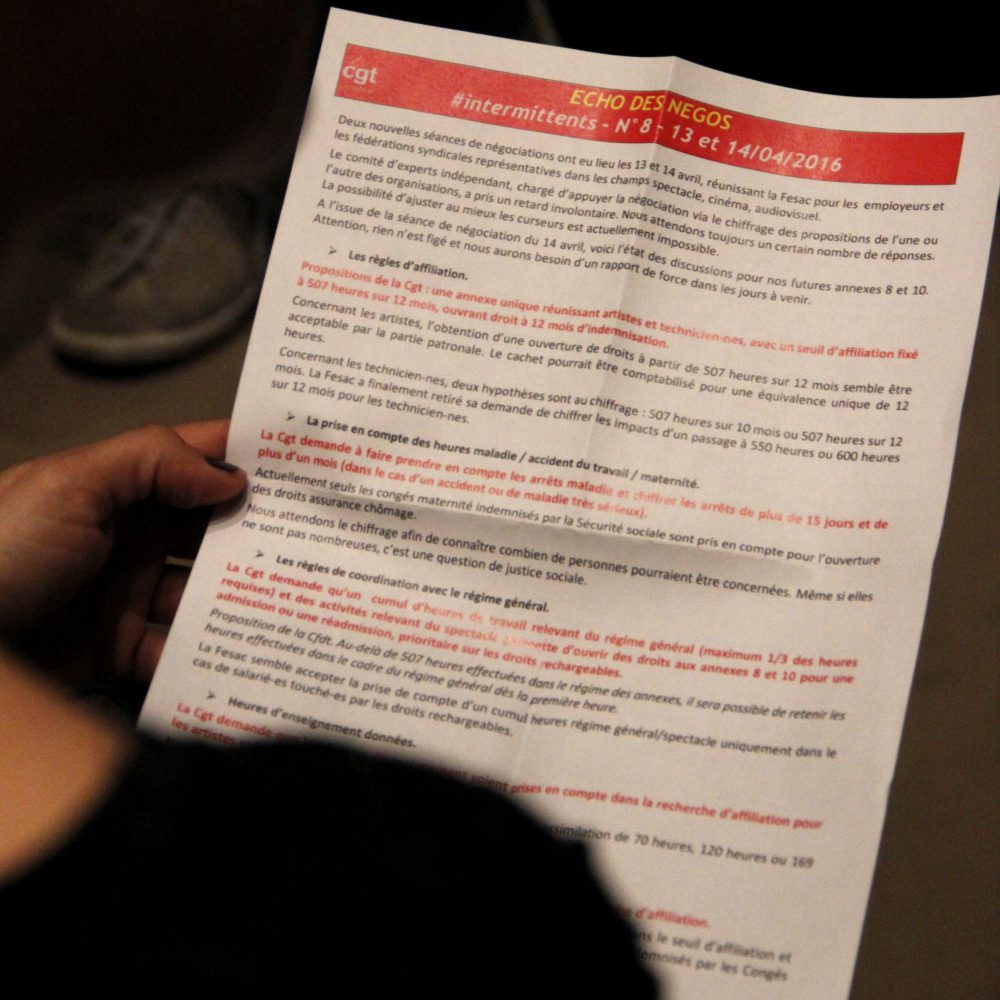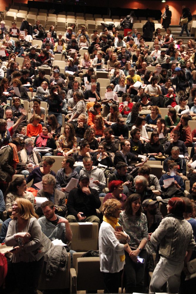 Hier soir avait lieu la seconde AG des intermittents, au théâtre de la Ville – Sarah Bernhardt, organisée par la CGT Spectacle et la Coordination des intermittents et précaires (CIP) : rendez-vous houleux, marqué par le débat, la colère et l’envie de se battre. Appel à la grève pour le 25 avril, proposition de rassemblements et d’actions multiples, travail sur la convergence des luttes, vote d’une grève reconductible à partir du 28 avril… autant de mesures adoptées dans une quasi-unanimité des personnes présentes.