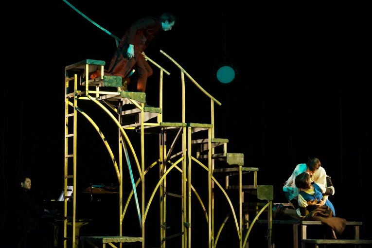 Pour décor, un escalier démembré, dont les marches sont en bois usé et l’armature en acier : « Il forme des angles, des espaces, explique le metteur en scène. Il crée un labyrinthe manipulé par Méphistophélès pour perdre Faust et Marguerite… » Les comédiens ne cessent de monter et de descendre les marches, les échelles, voire la structure métallique qui sous-tend chaque partie de l’escalier, sans que leurs pas ne semblent jamais les mener quelque part. L’effet n’est pas sans rappeler le tableau-livre pliant et roulant que montaient ou descendaient les comédiens-acrobates de la pièce d’Aurélien Bory, créée lors du dernier festival d’Avignon : Espaece. Dans l’une et l’autre proposition artistique, l’effet est saisissant, astucieux, parce qu’il épouse le propos soulevé.