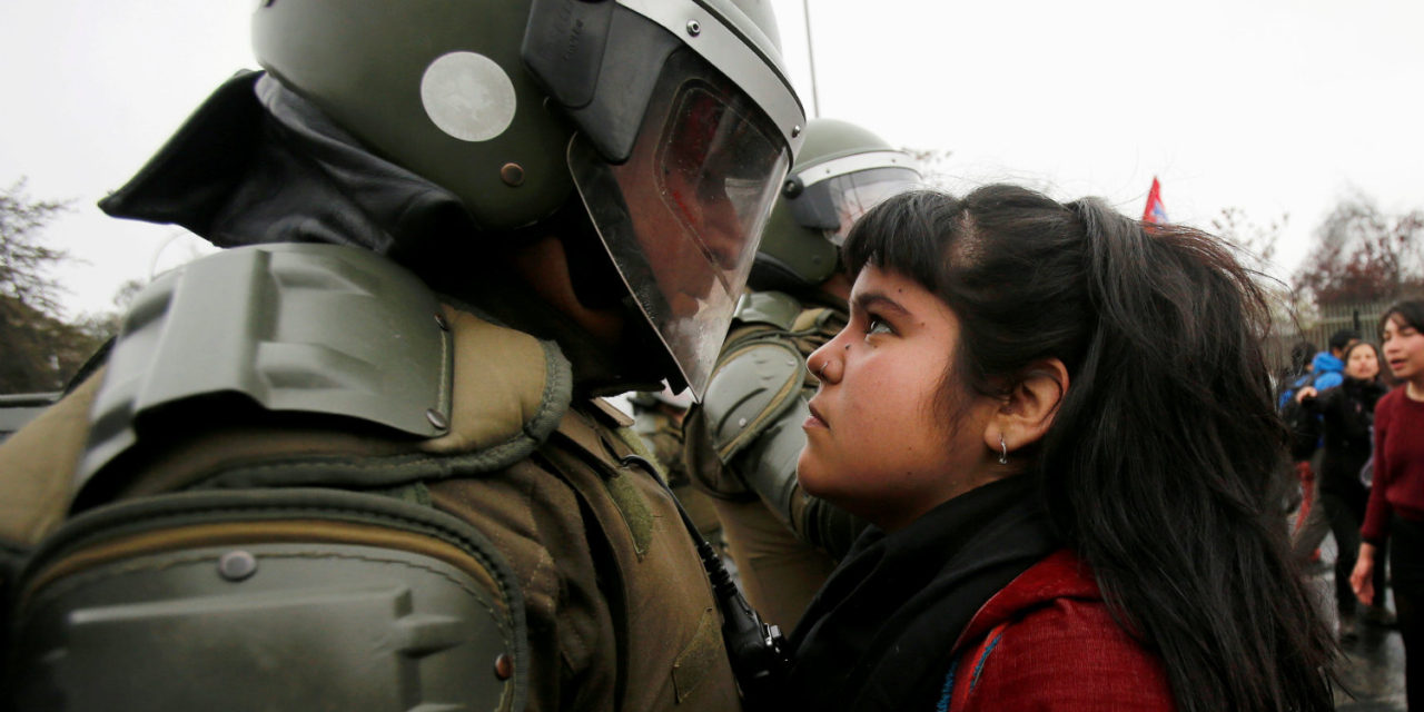 Photographie de Une – Jeune femme lors des manifestations au Chili, en 2016 (source : CNN)