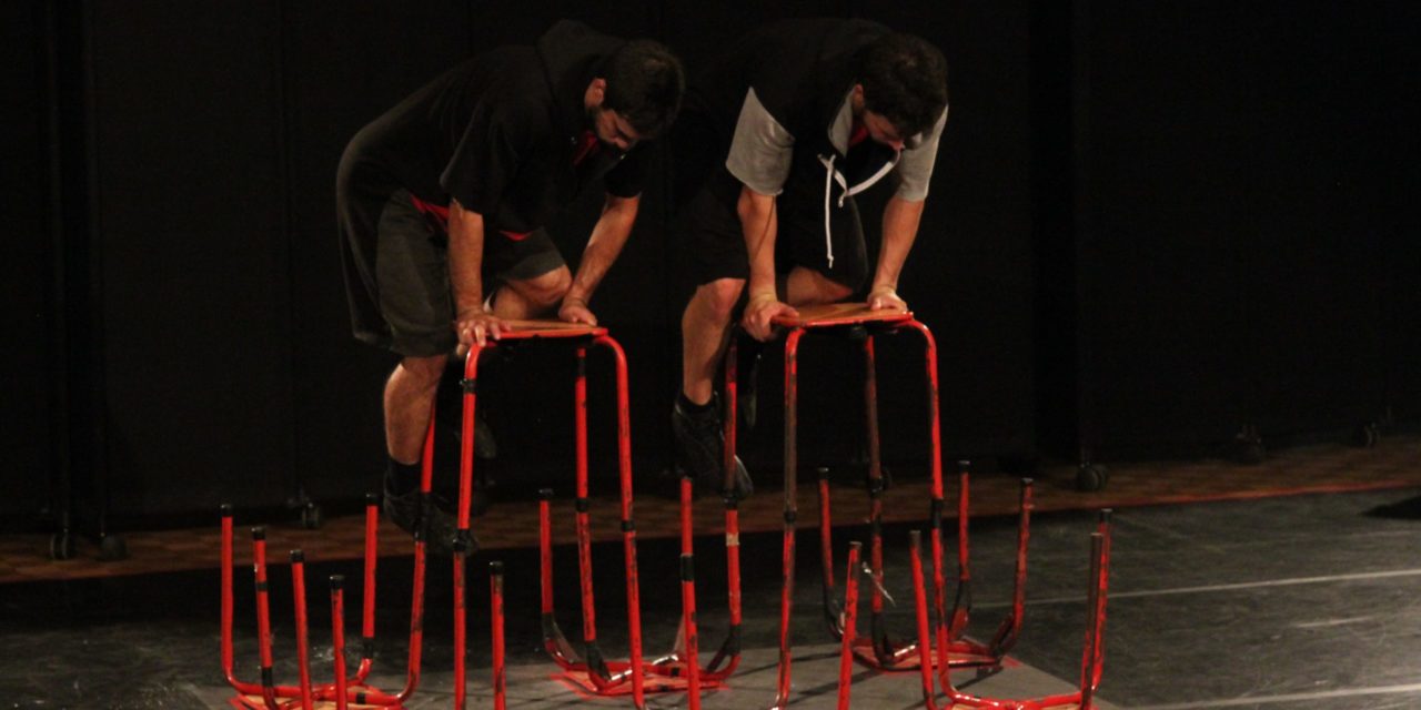Le spectacle s’achemine vers un main à main forcé des deux circassiens pour pouvoir monter sur les tabourets qui s’empilent, s’encastrent, dans un déséquilibre qui tient le public en haleine. La performance du duo repose ainsi sur la collaboration forcée autant que désirée qu’impliquent ces tabourets si fragilement empilés pour qu’on leur monte dessus.