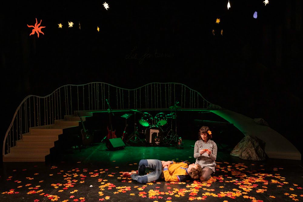 La scénographie magique d’Anouk Maugein : un plan incliné représentant un grand escalier, à la rampe de néon qui monte en arc de cercle au-dessus de la scène, et les mobiles en forme d’étoiles qui se balancent donnent d’entrée le ton de cette transposition. Au foyer Les Fontaines, on est incontestablement dans un monde à part.