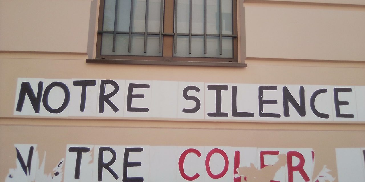 Les quais de gare, les halls, et les murs de la ville, ces mots NOTRE SILENCE NOTRE COLÈRE, d’une peinture