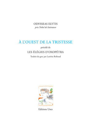 « La Poésie seule est / Ce qui demeure. Poésie. Juste essentielle et droite. » Ainsi s’achève, en forme de testament et de profession de foi, le dernier poème du dernier recueil d’Odysseas Elytis. Les Éditions Unes publient pour la première fois en français cet ultime recueil du poète grec, intitulé À l’Ouest de la tristesse, ainsi que le recueil qui l’a précédé, intitulé Les Elégies d’Oxopétra.