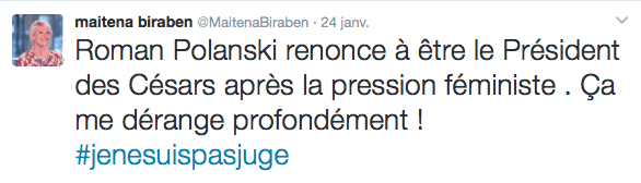 Illustration de cette mise à distance dérangeante : la déclaration de sa femme, Emmanuelle Seigner, qui dénonce la « méchanceté » et la « bêtise humaine », avec approximation et un manichéisme troublant ; le soutien de Gilles Lellouche estimant que, les faits précédant l’arrivée de Polanski en France, la polémique serait superflue ; ou encore le tweet de Maïtena Biraben, habituée du badbuzz, qui regrette la « pression des féministes » – mot assorti d’un hashtag à la moralité douteuse : #jenesuispasjuge.