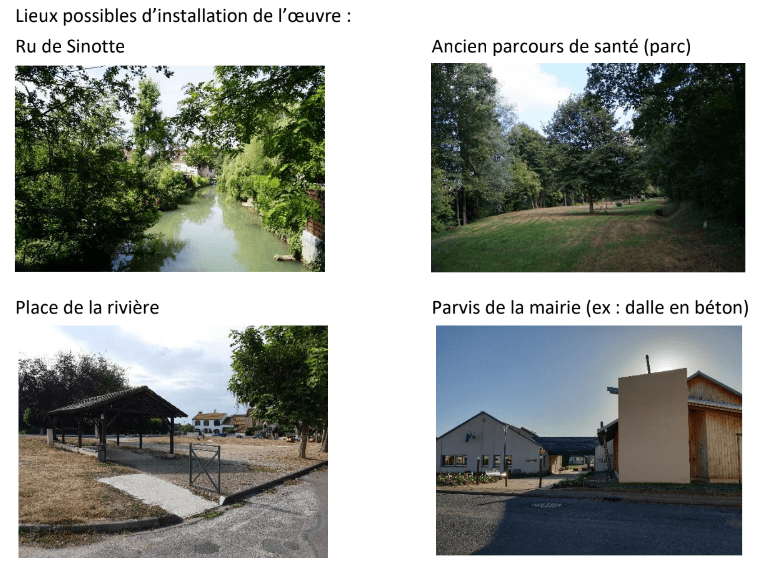 Les lieux ci-dessus sont des propositions. L’artiste retenu aura la possibilité de choisir un autre lieu, en accord avec la commune, et selon les contraintes techniques (terrain communal).