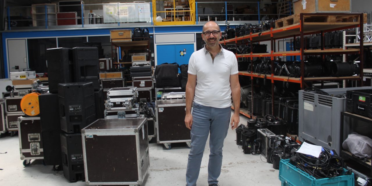 Photographie de Une – Stéphane Lepoil au milieu du parc de matériel (© Morgane Macé / Profession Spectacle)