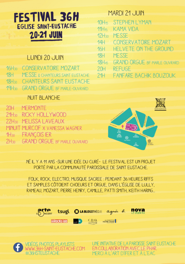 En lien avec la fête de la musique, le festival commence la veille (le 20 juin) et s’achève le 21 juin. Folk, rock, électro, musique sacrée : pendant 36 heures, riffs et samples côtoient chœurs et orgue dans l’église de Mozart, Lully, Rameau, Pierre Henry, Camille, Patti Smith, Keith Haring…