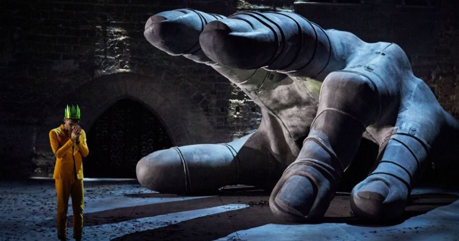 La scénographie s’impose d’emblée au spectateur qui retrouve – ou découvre – la Cour d’honneur du Palais des papes à Avignon. Un vaste visage couché et entravé, côté jardin, avec une bouche entrouverte qui laisse deviner le passage – de la parole, d’éventuels acteurs ; il n’en sera rien. Un main semi ouverte, avec l’annulaire et le majeur relevés, semble former côté cour une sorte d’emprise, de poigne faussement accueillante, probablement parce que je suis conditionné par la connaissance que j’ai déjà de la pièce que s’apprête à adapter Thomas Jolly.
