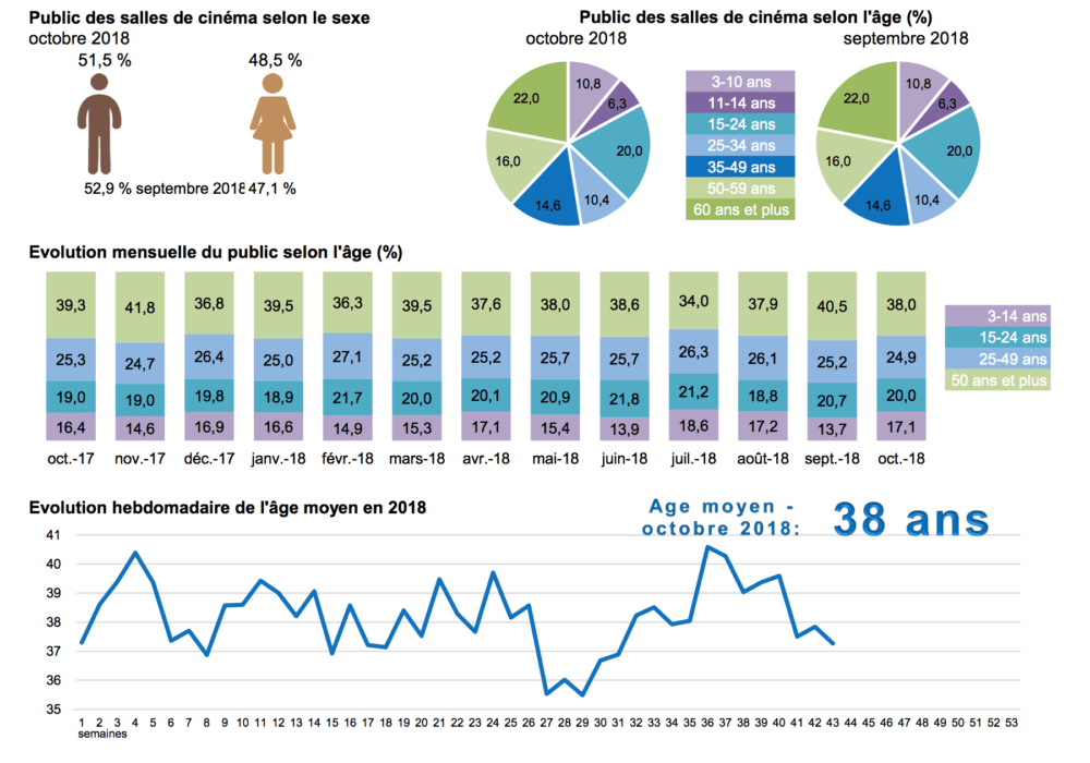 En octobre 2018, le public des salles de cinéma est principalement composé d’hommes (51,5 %, contre 52,9 % en septembre). Avec les vacances scolaires, la part des moins de 15 ans dans le public du mois d’octobre 2018 (17,1 %) progresse par rapport au mois de septembre (13,7 %). La part des 15-24 ans est relativement stable en octobre 2018 (20,0 %, contre 20,7 % en septembre), tandis que celle des seniors se réduit à 38,0 % (40,5 % en septembre). En octobre 2018, l’âge moyen des spectateurs de cinéma est de 38 ans (contre 39 ans en septembre).