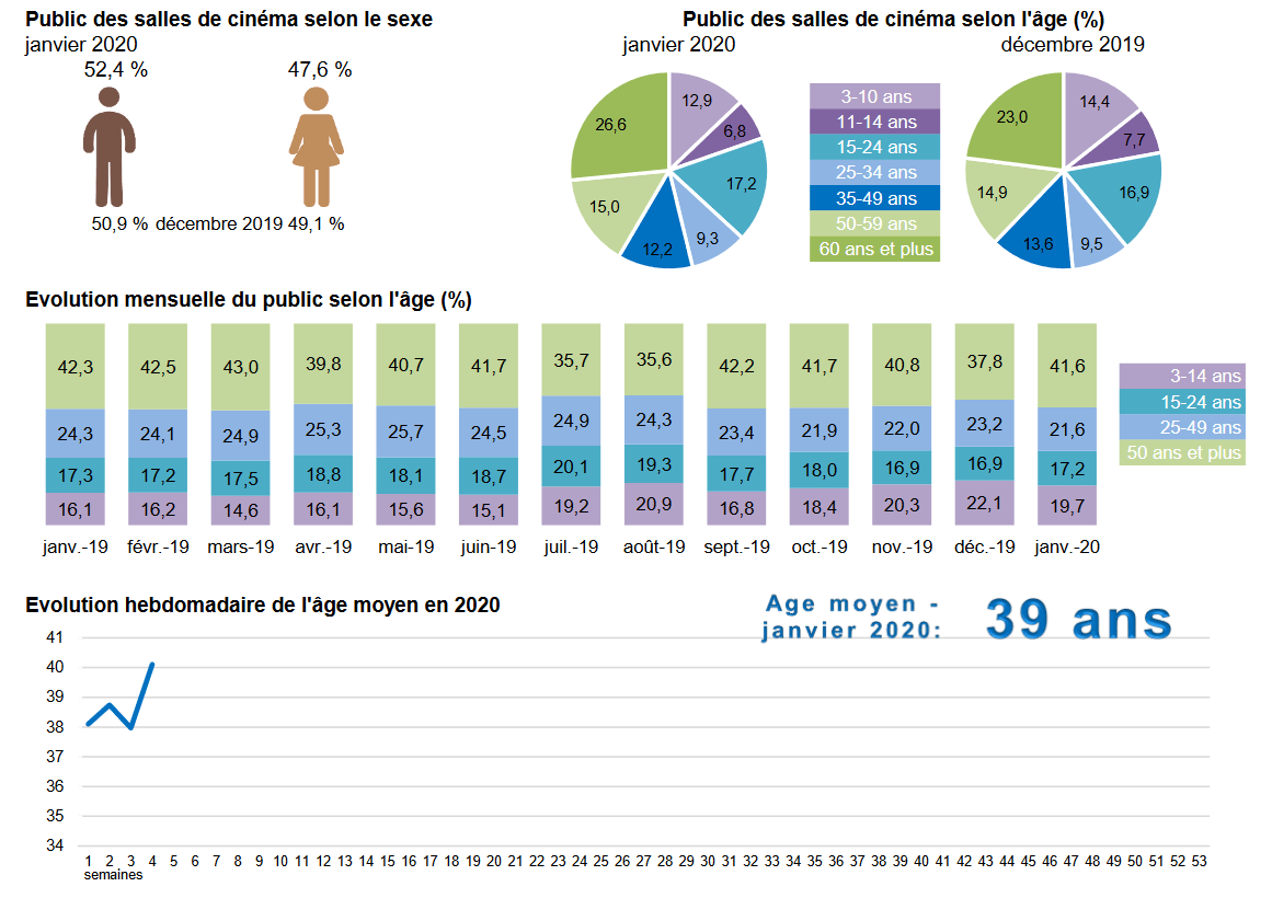 En janvier 2020, le public des salles de cinéma est principalement composé d’hommes (52,4 %, contre 50,9 % en décembre 2019). La part des moins de 15 ans dans le public du mois de janvier 2020 (19,7 %) se réduit de 2,4 points par rapport au mois de décembre 2019 (22,1 %). La part des 15-24 ans est relativement stable à 17,2 % (16,9 % en décembre), quand celle des seniors progresse à 41,6 % (37,8 % en décembre). En janvier 2020, l’âge moyen des spectateurs de cinéma est de 39 ans (37 ans en décembre).