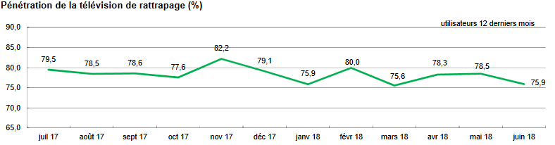 En juin 2018, 636,8 millions de vidéos sont visionnées sur les services de télévision de rattrapage du panel (composé de 23 chaînes dont 18 chaînes nationales), soit 21,2 millions de vidéos vues chaque jour. La consommation diminue de 6,7 % par rapport à juin 2018 et progresse de 16,9 % sur un an. La consommation de télévision en ligne, qui inclut la TVR ainsi que les bonus et la consommation des chaînes en direct sur les autres supports que la télévision, totalise 735,1 millions de vidéos vues en juin 2018 (-6,0 % sur un mois et +12,2 % sur un an). Les programmes jeunesse, le documentaire, la fiction et le cinéma totalisent 55,6 % des vidéos visionnées. Les meilleures audiences de télévision en ligne sont réalisées par Demain nous appartient pour le groupe TF1, Plus belle la vie pour le groupe France Télévisions, CNews pour le groupe Canal +, Moundir et les apprentis aventuriers pour le groupe M6, et Franky pour le groupe Lagardère Active.