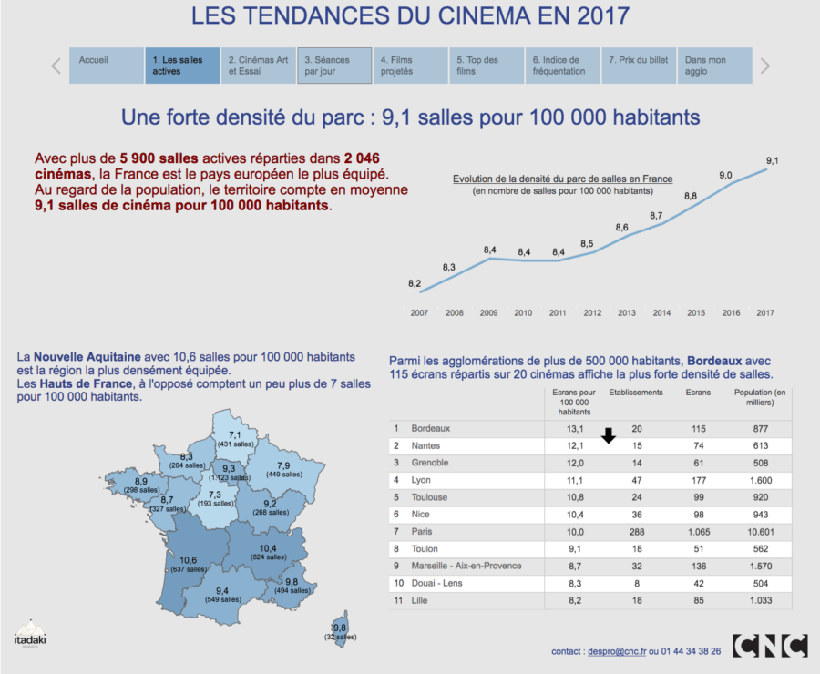 Pour la deuxième année consécutive, la direction des études, des statistiques et de la prospective du CNC publie des datavisualisations des grandes tendances de la géographie du cinéma.