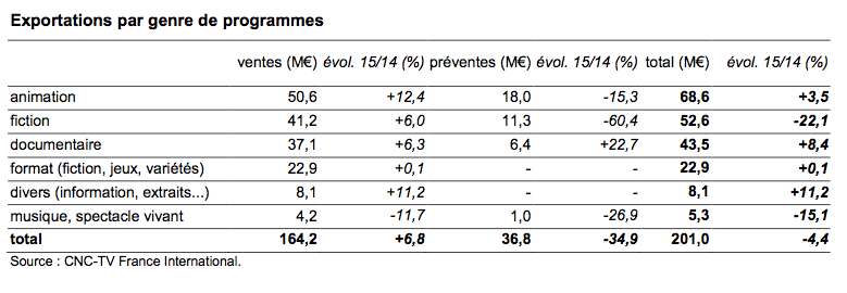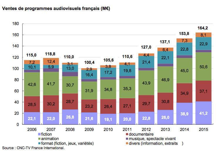 En 2015, la croissance des ventes de programmes français à l’étranger est soutenue par l’animation (+12,4 % à 50,6 M€), la fiction (+6,0 % à 41,2 M€) et le documentaire (+6,3 % à 37,1 M€). Les ventes de formats (fiction, jeux, variétés) sont stables (+0,1 % à 22,9 M€).