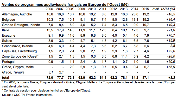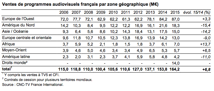 En 2015, plusieurs régions affichent des résultats en hausse. Les achats en Europe de l’Ouest augmentent de 3,3 % et renforcent le statut de première zone d’accueil des productions françaises. Ces achats sont portés par la croissance des marchés francophones (Belgique, Suisse) qui confirment leurs acquisitions en favorisant le documentaire et l’animation. De même, on enregistre une forte activité en Espagne (+70,7 %) ainsi qu’au Royaume-Uni (+19,3 %).