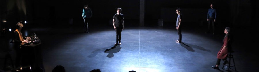 Un texte d’une telle qualité n’est pas sans piège pour le metteur en scène, tant il convient de ne forcer aucun trait pour en garder le précieux équilibre. Justine Simonot se saisit avec (grand) talent de la force tragique – au sens antique du vocable – des mots du dramaturge. Lorsque le spectateur entre dans la salle, tous les comédiens sont déjà sur scène, dans la pénombre en raison de cinq projecteurs braqués violemment sur le public. La création lumière de Jean-Gabriel Valot frôle la perfection : ce lumineux jaillissement frontal nous dit d’emblée la surexposition médiatique de l’événement historique, qui rejette les hommes dans un obscur oubli. L’humanité est en échec, il ne nous reste que les voix pour percer la ténèbre, avec les mots de l’artiste. « Les » voix, et non « la » voix, ainsi que la mise en scène le suggère par les mouvements si précis de ces personnages : il y a une poly-phonie assumée, loin de toute uni-vocité.