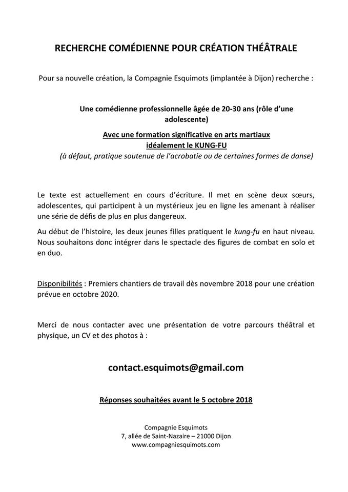 Envoyez avant le 5 octobre 2018 une présentation de votre parcours théâtral et physique, un CV et des photos à : contact.esquimots@gmail.com