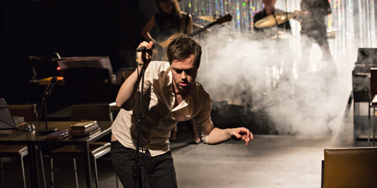 Savez-vous qu’un coup de feu, c’est l’équivalent de 120 décibels ? Soit le volume d’un concert de rock. Voilà le genre de chose qu’on apprend dans cette forme ni conférence ni concert. L’originalité de la proposition de Mathieu Bauer repose sur une mise en scène faisant du public un spectateur-auditeur : « J’aime les concerts qui ont à cœur une certaine scénarisation et à l’inverse les pièces de théâtre qui s’appuient sur la musique pour déployer leur sens », confiait-il dans une interview au magazine de Seine-Saint-Denis en décembre 2016. Les cinq comédiens sont aussi musiciens. Ou les cinq musiciens sont comédiens… On ne sait plus.