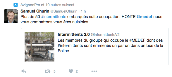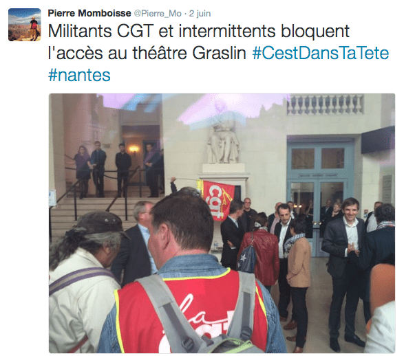 18h30 – Une cinquantaine d’intermittents et de militants CGT ont investi le hall du théâtre Graslin à Nantes, empêchant près de 150 entrepreneurs d’entrer et de se réunir, dans le cadre d’une soirée organisée par le centre des jeunes dirigeants d’entreprise.