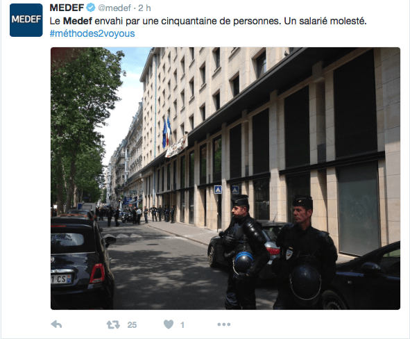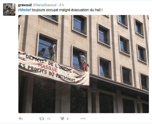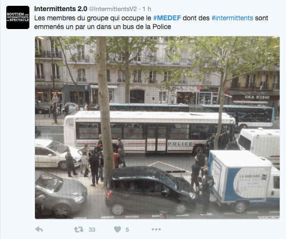 150 salariés, artistes et techniciens intermittents du spectacle, occupent pacifiquement le siège du Medef, à la suite de l’assemblée générale de la CGT spectacle et de la CIP-Idf qui s’est tenue hier soir, le 6 juin.