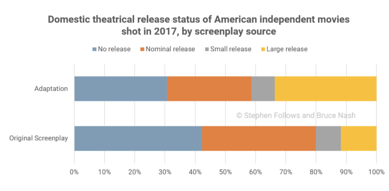 L’autre observation qui ressort de cette étude, c’est que les adaptations ont plus de chance de paraître dans les cinémas que les scénarios originaux. 24 % des films indépendants produits aux États-Unis en 2017 étaient inspirés de faits réels, de livres ou d’autres sources. L’étude révèle que ces adaptations avaient trois fois plus de chance d’être diffusées en salle que des films issus de créations originales.
