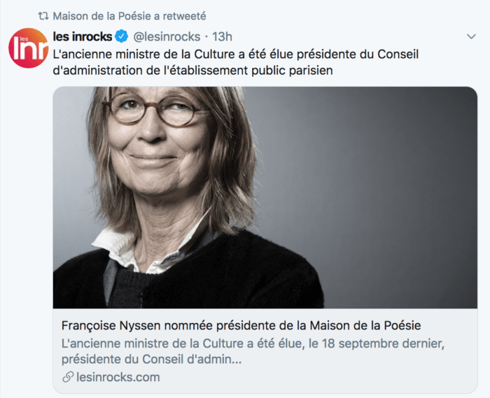 Selon une information communiquée par nos confrères des Inrocks, l’ancienne ministre de la Culture Françoise Nyssen a été élue, le 18 septembre dernier, présidente du Conseil d’administration de la Maison de la Poésie.