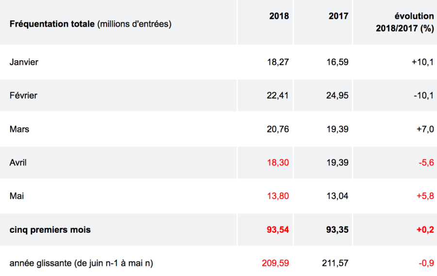 Selon les dernières estimations de la direction des études, des statistiques et de la prospective, la fréquentation cinématographique atteint 13,80 millions d’entrées au mois de mai 2018, soit une hausse de 5,8 % par rapport à mai 2017. 93,54 millions d’entrées ont été réalisées au cours des cinq premiers mois de 2018, soit le même niveau que sur les cinq premiers mois de 2017. Sur les 12 derniers mois écoulés, les entrées dans les salles sont estimées à 209,59 millions (-0,9 % par rapport aux 12 mois précédents).