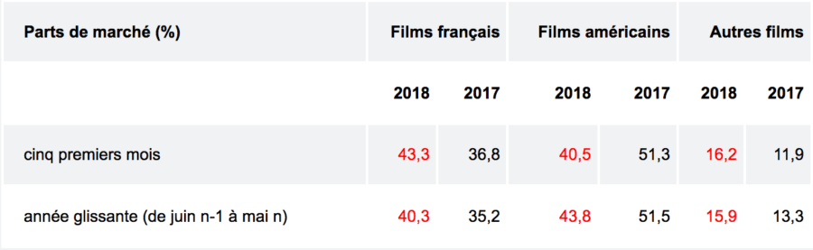 La part de marché des films français est estimée à 43,3 % sur les cinq premiers mois de l’année (36,8 % sur les cinq premiers mois de 2017), celle des films américains à 40,5 % (51,3 % sur janvier-mai 2017) et celle des autres films à 16,2 % (11,9 % sur janvier-mai 2017). Sur les douze derniers mois, la part de marché des films français est estimée à 40,3 %, celle des films américains à 43,8 % et celle des autres films à 15,9 %.