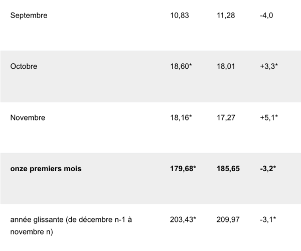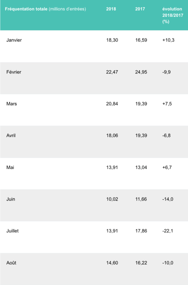 179,68 millions d’entrées ont été réalisées au cours des onze premiers mois de 2018, soit 3,2 % de moins que sur les onze premiers mois de 2017. Sur les 12 derniers mois écoulés, les entrées dans les salles sont estimées à 203,43 millions (-3,1 % par rapport aux 12 mois précédents).