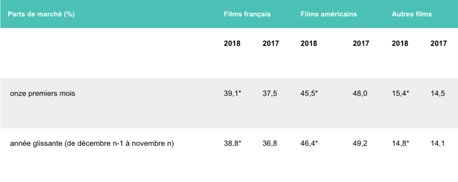 Sur les onze premiers mois de l’année, les films français réalisent 70,33 millions d’entrées en progression de 1 %, les films américains 81,70 millions en baisse de 8,3 % et les films d’autres nationalités 27,66 millions (+2,9 %). La part de marché des films français est estimée à 39,1 % sur les onze premiers mois de l’année (37,5 % sur les onze premiers mois de 2017), celle des films américains à 45,5 % (48,0 % sur janvier-novembre 2017) et celle des autres films à 15,4 % (14,5 % sur janvier- novembre 2017). Sur les 12 derniers mois, la part de marché des films français est estimée à 38,8 %, celle des films américains à 46,4 % et celle des autres films à 14,8 %.