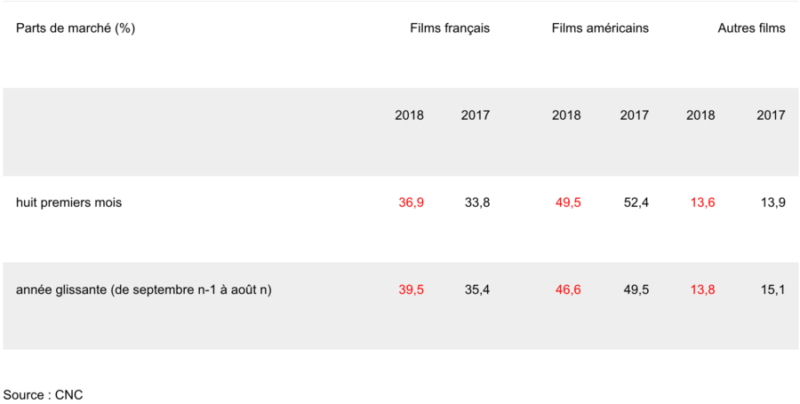 Dans ce contexte le cinéma français tire son épingle du jeu : la part de marché des films français est estimée à 36,9 % sur les huit premiers mois de l’année, en forte hausse par rapport à 2017 (33,8 % sur les huit premiers mois de 2017), tandis que celle des films américains baisse à 49,5 % (52,4 % sur janvier-août 2017) et celle des autres films est stable à 13,6 % (13,9 % sur janvier-août 2017). Sur les 12 derniers mois, la part de marché des films français est estimée à un niveau très élevé, 39,5 %, celle des films américains à 46,6 % et celle des autres films à 13,8 %.