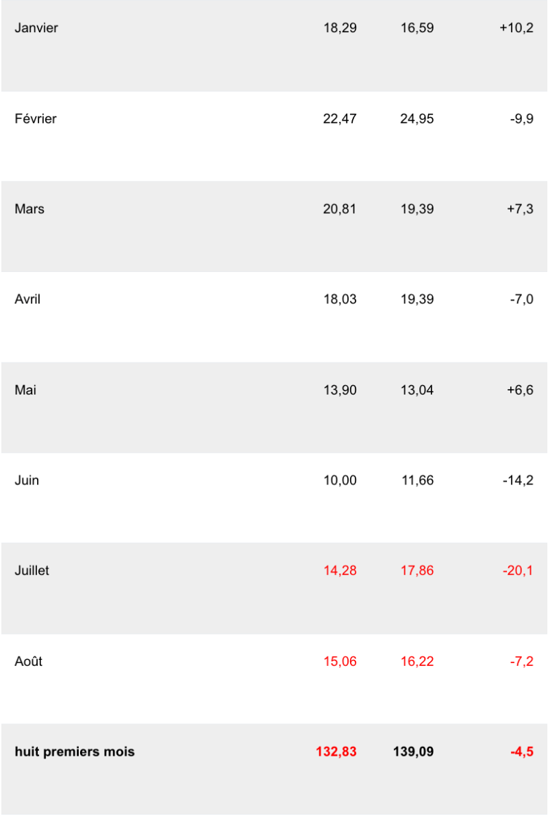 132,83 millions d’entrées ont été réalisées au cours des huit premiers mois de 2018, soit 4,5 % de moins que sur les huit premiers mois de 2017.
