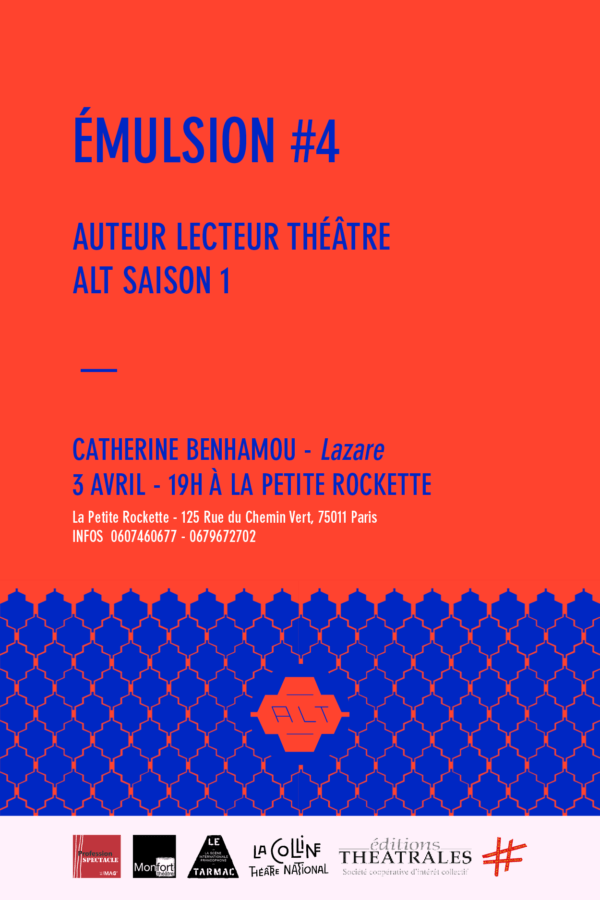 Je suis très contente que vous ayez choisi Lazare, c’est une pièce qui me tient vraiment à cœur. Je l’ai écrite il y a quatre ans. Elle a été mise en espace et lue en public à plusieurs reprises, elle a été sélectionnée par le comité de lecture de l’Apostrophe en 2014, élue Coup de cœur du public et mise en espace à l’Apostrophe par Jean-Paul Rouvrais, puis j’ai arrêté de la faire circuler.