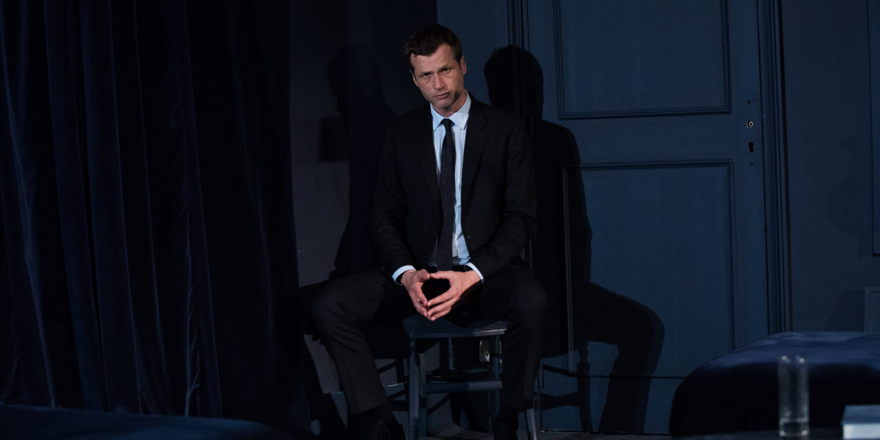 Rideau bleu, fauteuils bleus, costume bleu signé Paul Smith, jusqu’au mot « bleu » qui scande à intervalles réguliers la traduction du texte… L’univers est celui du thriller, du polar noir (et bleu). Robert Plagnol évolue au milieu de ces codes identifiés, mais il manque la surprise, l’inattendu, peut-être une angoisse que permettraient les ombres cinématographiques, les effets spatio-temporels qui mettent le personnage dans un autre temps, un autre lieu.