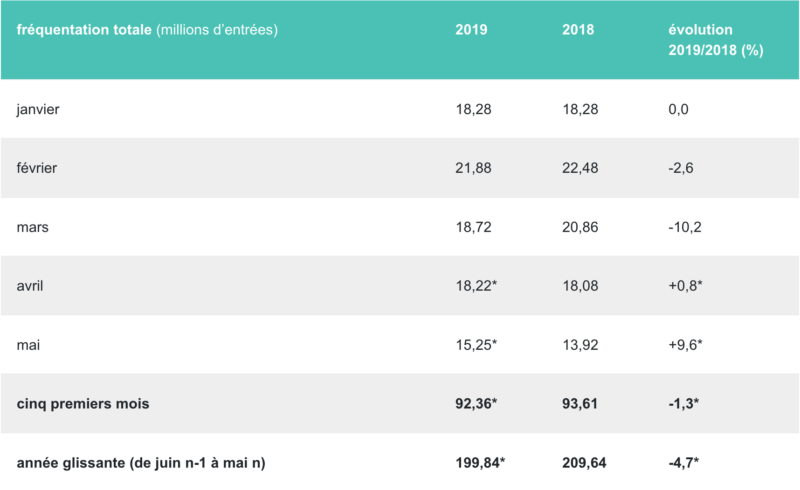 Trois films enregistrent plus d’un million d’entrées sur ce mois en 2019, dont un film américain, un français et un britannique. Deux films enregistraient également plus d’un million d’entrées en mai 2018, tous américains. Sur les cinq premiers mois de l’année, la fréquentation atteint 92,36 millions d’entrées en recul de 1,3 % par rapport aux cinq premiers mois 2018. Sur les 12 derniers mois écoulés, les entrées dans les salles sont estimées à 199,84 millions, en recul de 4,7 % par rapport aux 12 mois précédents.