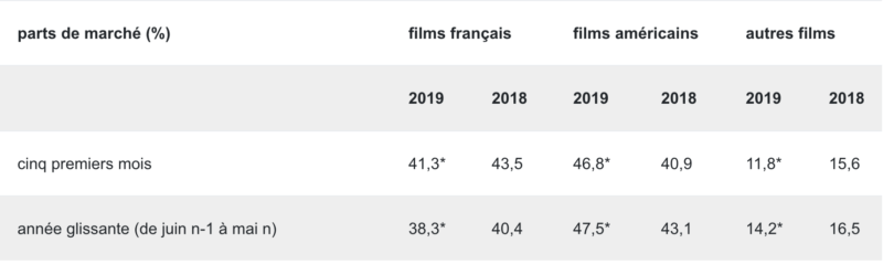 La part de marché des films français est estimée à 41,3 % sur les cinq premiers mois de 2019 (43,5 % sur la même période de 2018) et celle des films américains à 46,8 % (40,9 % en 2018). Sur les 12 derniers mois, la part de marché des films français est estimée à 38,3 %, celle des films américains à 47,5 % et celle des autres films à 14,2 %.