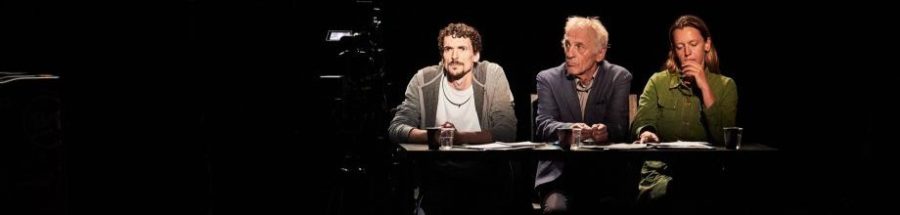 Dans La Reprise. histoire(s) du théâtre (I), première d’une série consacrée au théâtre, Rau et son équipe partent d’un fait divers : le meurtre en 2012 à Liège d’Ihsane Jarfi. Enlevé à la sortie d’un bar gay où il célébrait un anniversaire, le trentenaire fut torturé puis assassiné par quatre hommes, et son corps retrouvé une dizaine de jours après sa disparition. Se saisissant de ce meurtre qui fut lors du jugement qualifié d’homophobe, Milo Rau y entremêle avec extrêmement d’habileté des réflexions sur le théâtre et y intègre le processus même de construction du spectacle. Le spectacle débute, ainsi, par un monologue du célèbre acteur belge de cinéma et de télévision Johan Leysen. Évoquant les rituels qu’affectionnent les comédiens avant d’entrer en scène, leurs rapports à leur personnage, leurs relations avec les metteurs en scène, Johan Leysen se remémore son incarnation du spectre du père d’Hamlet dans la pièce éponyme de Shakespeare. Cette tirade, il l’interprète tandis que des fumigènes envahissent le plateau, avant de quitter la scène. Suit, sur grand écran, un intermède, soit la projection de l’image d’une usine – usine qui reviendra à plusieurs reprises, souvent sous un angle différent – et le déroulé d’un générique introductif. Retour ensuite au plateau, avec un tout autre dispositif : plein-feux, table située côté cour où les trois comédiens professionnels seront assis. Cette fois, c’est la genèse du spectacle, soit l’intérêt du comédien Sébastien Foucault pour le procès qui nous est exposé. Puis, nous assistons à la reconstitution – la reprise – du casting destiné à trouver les comédiens amateurs de La Reprise. Suzy Cocco, Fabian Leenders, Tom Adjibi se succèdent, la captation en direct de leur audition projetée au-dessus d’eux. Racontant leur vie précaire, les trois interprètes répondent ensuite à des questions posées par les comédiens professionnels : « As-tu déjà fait du théâtre ? Qu’as-tu fait ? Comment vis-tu la retraite ? Qu’as-tu déjà fait d’extrême sur un plateau ? Imagines-tu te mettre nue ? » Dans ce prologue à deux faces (prologue à toute représentation avec le monologue de Leysen, prologue aux répétitions de La Reprise avec l’audition des acteurs), ces deux séquences concentrent ce qui caractérise l’ensemble de la proposition : le processus de création et de recherche alimente le contenu de ce qui se joue au plateau en étant lui-même mis en scène.