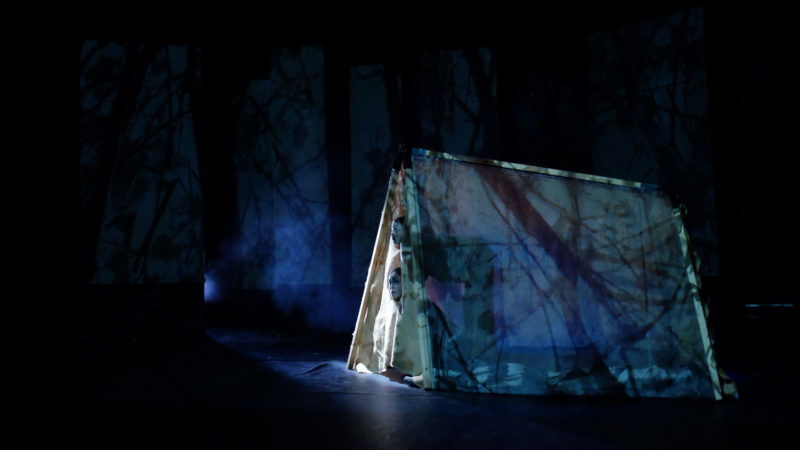 Reste que l’ambiance, elle, s’installe réellement, pleinement. Outre la musique concrète déjà mentionnée, il y a ces grands panneaux verticaux et fragmentés, au fond de la scène, qui rappellent les jungles peuplées d’immenses feuilles effilées et sombres du peintre Henri Rousseau, ou encore le jeu d’ombres chinoises et avec les lampes torches. Il y a/aura aussi (le lieu de la sortie de résidence ne se prêtant pas à l’utilisation d’une machine à brouillard, pour des raisons de sécurité, nous ne pouvons rien dire de ce choix technique) une brume afin d’intensifier le caractère irréel de l’atmosphère nocturne.