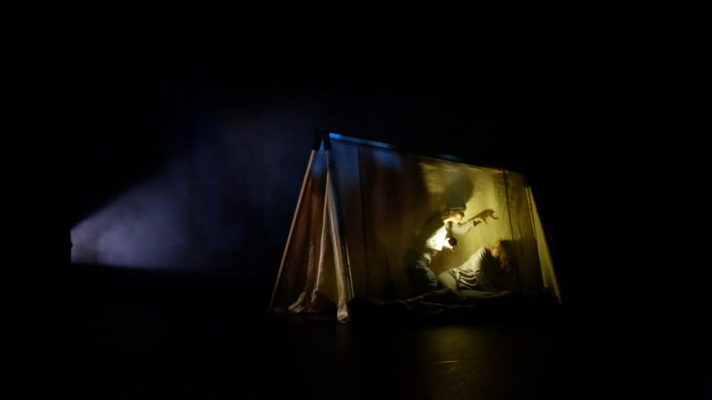 La Compagnie du Sarment vient de présenter sa mise en scène de La tente, texte de l’écrivain jeunesse Claude Ponti : l’histoire de deux enfants qui affrontent leur peur lors d’une nuit sous la tente. Ce récit, inédit au théâtre, décrypte le mécanisme de la peur de manière très directe, dans le but de la contrôler. Déployée par un décor réaliste et une musique acousmatique intelligente, la mise en scène joue sur l’immersion, dont nous sort malheureusement parfois une interprétation qui tire vers l’infantilisation.