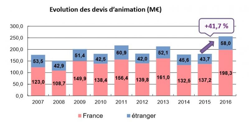 Même envol pour la question financière. Entre 2015 et 2016, les devis ont augmenté de 41,7 %, atteignant plus de 256 millions d’euros l’année dernière. Les films d’animation chiffrent d’ailleurs des devis près de deux fois supérieurs à l’ensemble de la production française agréée de 2016.